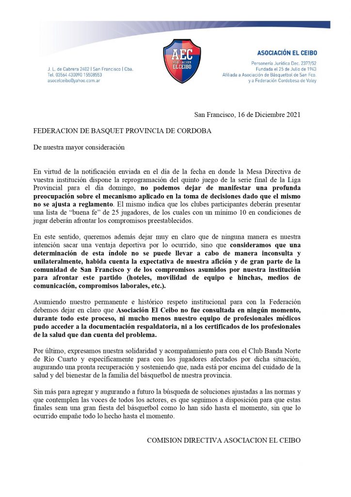 La dirigencia del Club El Ceibo le hizo llegar a la Federación de Básquet de la Provincia, a través de un comunicado, su descontento con la determinación de posponer el quinto punto de la final.