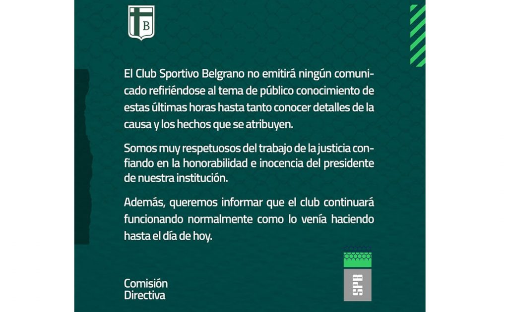 “El Club Sportivo Belgrano no emitirá ningún comunicado refiriéndose al tema de público conocimiento de estas últimas horas hasta tanto conocer detalles de la causa y los hechos que se atribuyen.