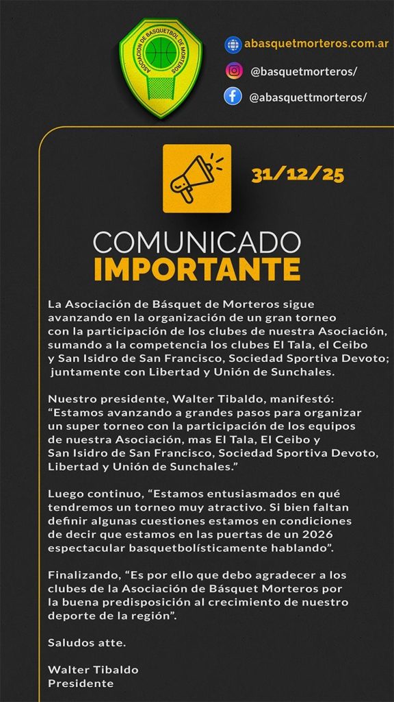 La oficialización se realizó mediante un comunicado firmado por el presidente de la entidad, Walter Tibaldo, quien destacó el trabajo que se viene desarrollando para concretar un certamen de alto nivel deportivo. Según lo informado, el torneo contará con la participación de los clubes pertenecientes a la Asociación de Básquet de Morteros y sumará a El Tala, El Ceibo y San Isidro de San Francisco, Sociedad Sportiva Devoto, Libertad y Unión de Sunchales, ampliando así el alcance y la competitividad del certamen.