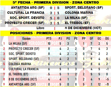 Sportivo Belgrano goleó 5-0 a Antártida Argentina como visitante por la 5° fecha del Clausura de la Zona Centro. Proyecto Crecer ganó en casa y La Milka no pudo en Devoto. Mirá.